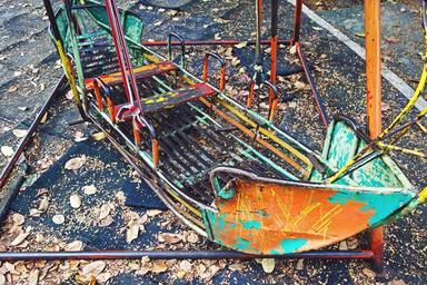 Keywords: park closed abandoned playground creepy rusted weathered run-down lifestyle toy metal swing boat