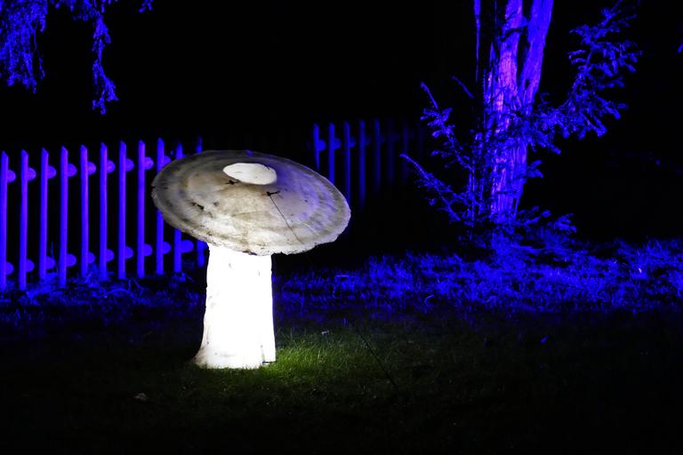 Keywords: park parking lights gruga eat sculpture gruga eat north rhine westphalia tourism evening night darkness dark light lighting light installation fig forest mushroom wood nature