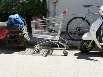 Keywords: park parking shopping cart road alternate space wheel bike two wheeled vehicle motor scooter traffic