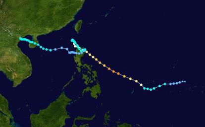 | Keywords: Parma 2009 track.png Track map of Typhoon Parma of the 2009 Pacific typhoon season The points show the location of the storm at 6-hour intervals The colour represents the storm's maximum sustained wind speeds as classified in the Saffir-Simpson Hurricane Scale see below and the shape of the data points represent the nature of the storm according to the legend below User Nilfanion/Tc/T Created by Cyclonebiskit using Wikipedia WikiProject Tropical cyclones/Tracks The background image is from NASA Tracking data switch source from the National Hurricane Center <sup>http //www nhc noaa gov/pastall shtml</sup> from the Central Pacific Hurricane Center <sup>http //www prh noaa gov/cphc/summaries/</sup> from the Joint Typhoon Warning Center <sup>https //metocph nmci navy mil/jtwc/best_tracks/</sup> from the Japan Meteorological Agency <sup>http //www jma go jp/jma/jma-eng/jma-center/rsmc-hp-pub-eg/besttrack html</sup> from the National Hurricane Center <sup>http //www nhc noaa gov/pastall shtml and the Central Pacific Hurricane Center http //www prh noaa gov/cphc/summaries/</sup> from the Central Pacific Hurricane Center <sup>http //www prh noaa gov/cphc/summaries/ and the Joint Typhoon Warning Center https //metocph nmci navy mil/jtwc/best_tracks/</sup> from the w National Hurricane Center <sup>http //www nhc noaa gov/pastall shtml</sup> or the Joint Typhoon Warning Center <sup>https //metocph nmci navy mil/jtwc/best_tracks/</sup> 2009-10-01 Cyclonebiskit Typhoon Parma 2009 2009 Pacific typhoon season track maps |
