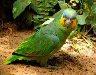 Keywords: parrot on the floor looking pet bird zoo tropical bird brazilian