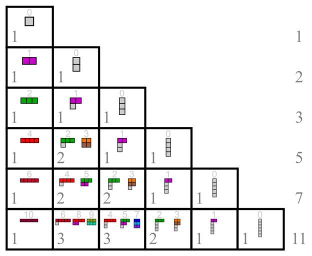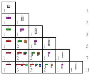 | Keywords: Partitions of n with k addends.svg Illustration of the triangle A008284 <br> showing the number of partitions of n <small> top to bottom starting from 1 </small> with k <small> left to right starting from 1 </small> addends<br> The partitions are represented by Young diagrams <br> The row sums on the right are the partition numbers A000041 The big numbers in Times New Roman show the number of partitions in the respective box of the triangle <br> The small numbers in Arial show the index number of the partition below compare this table Compare <br> thumb left 300px With biggest addend k<br> reflected Young diagrams thumb right 300px Set partitions up to rotation and reflection own Mate2code Integer partitions Young diagrams Triangles of numbers Colored partitions violet green brown red |