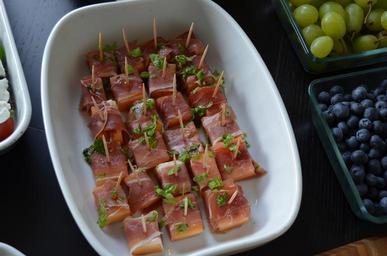 Keywords: party food snacks tasty delicious dining party people eating finger food celebration melon and ham canape melon parma