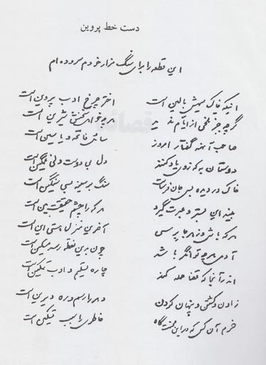 | Keywords: Parvin E'tesami handnote.jpg fa شعر اینکه خاک سیه اش بالین است اختر چرخ ادب پروین است گر چه جز تلخی از ایام ندید هر چه خواهی سخنش شیرین است صاحب آن همه گفتار امروز سائل فاتحه و یاسین است دوستان به که ز وی یاد کنند دل بی دوست دلی غمگین است خاک در دیده بسی جان فرساست سنگ بر سینه بسی سنگین است بیند این بستر و عبرت گیرد هر که را چشم حقیقت بین است هر که باشی و ز هر جا برسی آخرین منزل هستی این است آدمی هر چه توانگر باشد چون بدین نقطه رسد مسکین است اندر آنجا که قضا حمله کند چاره تسلیم و ادب تمکین است زادن و کشتن و پنهان کردن دهر را رسم و ره دیرین است خرم آنکس که در این محنت گاه خاطری را سبب تسکین است پایان شعر < 1941 unknown photographer PD-Iran other versions PD-old Uploaded with UploadWizard Parvin E'tesami |