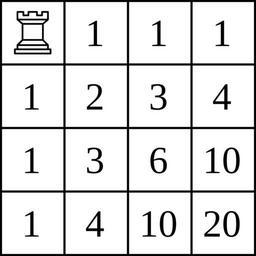 Keywords: Pascal's triangle pathways.svg Created with Inkscape The Pascal's triangle overlaid on a grid with the number on each square representing the number of possible pathways to take from 0 0 assuming only down and right moves are allowed To get to 3 3 20 pathways are possible corresponding to <math>_6 \mathrm C _3</math> Chess_tile_rl svg 50 2012-04-25 18 55 UTC Chess_tile_rl svg David Benbennick derivative work Eviatar Bach </nowiki> Uploaded with derivativeFX Chess rooks Pascal's triangle Files by User InverseHypercube