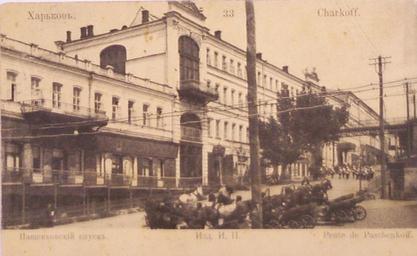 | Keywords: Paschenkovsky Spusk.jpg Kupechesky or Paschenkovsky Spusk in Kharkov Russian Empire Postcard ru Пащенковский Купеческий спуск Подъём от Клочковской на Униве ситетскую го ку Слева пассаж Пащенко аз ушенный во в емя войны - на его месте сейчас те асный скве Пешеходный металлический мост пе еб ошенный на фото над спуском уцелел; после войны его пе енесли в Го одской сад имени Шевченко 1890-1900th Russian Empire Post; Unknown; на отк ытке не указан PD-old PD-RusEmpire Sobornyi Descent Unidentified year in Kharkiv |