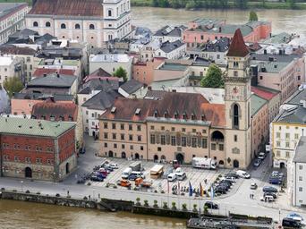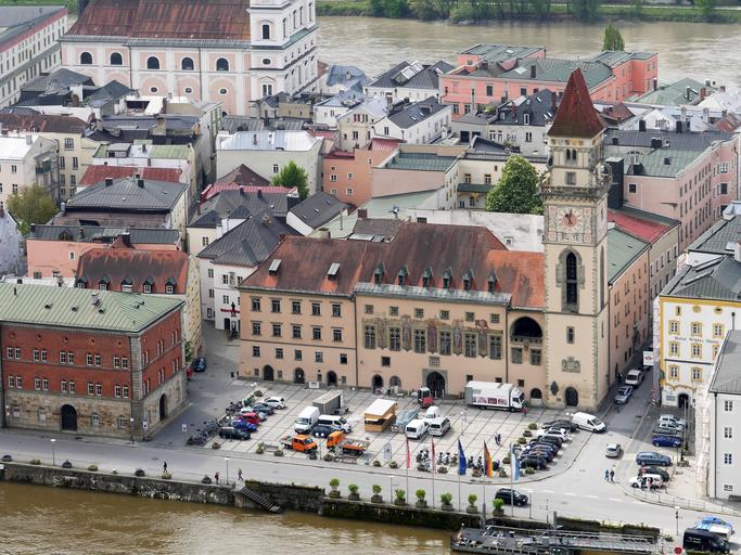 Keywords: passau town hall square bank of the danube old town clock tower city tower investors danube inn bird's eye view veste oberhaus bavaria niederbayern episcopal see sheet roofs