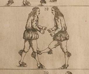 Keywords: Passchen38.jpg en fig 38 kick to the knee 1659 Vollständiges Ring-Buch Johann Georg Passchen PD-old-100 Martial art diagrams Historical European martial arts Kicking in art Men in art