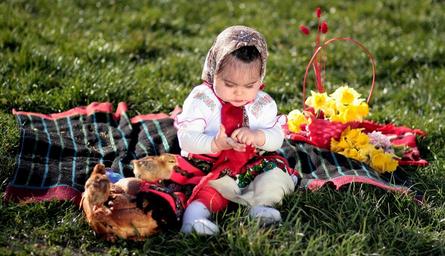 Keywords: pasta toddler girl egg traditional costume green flowers grass