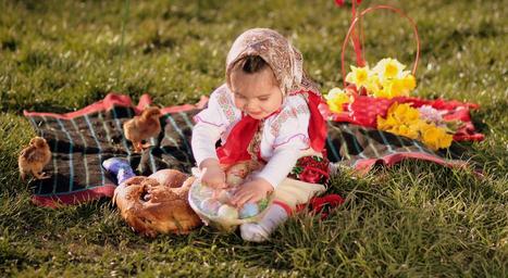 Keywords: pasta toddler girl egg traditional costume green flowers grass