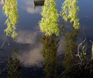 Keywords: pasture branches leaves green water mirroring reflections surface beautiful to look at