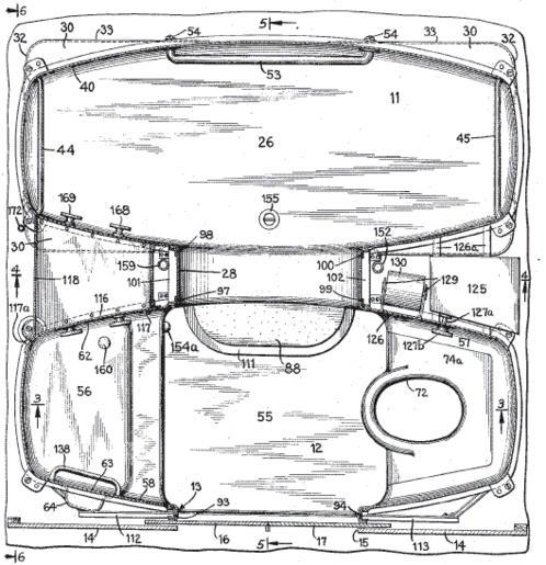 Keywords: Pat2220482fig2.GIF Figure 2 from U S Patent No 2 220 482 Issued Nov 5 1940 Prefabricated Bathroom The interior of Buckminster Fuller's famous prefabricated bathroom that integrates tub water closet and lavatory It lacks windows so it can fit more locations It is constructed of light bacteriostatic alloys copper or steel coated with 97 tin and 3 silver in four quarter-parts each portable by two people through doorways The unused sides of the metal are coated with asphalt and fabric to deaden noise 11 is the bathtub chamber 12 the lavatory and water closet Lavatory 12 can be used alone as a half-bath All corners are radiused to 4 10cm to ease cleaning All parts fit to drain inside preventing water damage in the supporting structure Sliding doors 16 and 17 are compact and provide privacy The top of entranceway 28 has a single light bulb not shown with a waterproof window on each chamber There's a large quiet ventilation fan not shown under sink 56 It draws fog and odors down away from head level The tub's floor is 9 23cm higher than the lavatory floor reached by a 4 12cm step 111 surfaced with nonslip cork 88 The height makes entering and cleaning easier An electric resistive heater in step 111 warms the floors tub and commode by conducting heat through their metal The light fan and heater can be controlled from inside or outside the bathroom which also has an optional exterior signal light to show that it is in use The tub has bars to be both towel racks and balance-bars 44 45 54 Four niches 30 are for bath accessories and further hand-holds Stand-pipe 172 leads to the shower head not shown The shower head and spigot face away from entranceway 28 to reduce splashing Hot 168 and cold 169 water knobs with a third knob not shown to select the shower head or spigot Knobs are within reach from entranceway 28 There's an overflow outlet not shown below the lip of entranceway 28 It connects with drain 155 which has a trap accessible under step 111 The lavatory has a sink 56 and commode 72 Sink 56 has a spigot facing away from the user to reduce splashing It also has built-in accessories drain 160 with an overflow drain accessible trap 154 soap dish 64 and towel rack 138 Medicine cabinet 118 has door 116 which opens outward and has a mirror on its inside thereby kept dry and free of fogging The toilet paper compartment door 126 is hinged on the bottom and mounts toilet paper 130 with bracket 129 Door 126 tilts out to replace the toilet paper 130 The flush for toilet tank 125 is handle 127 U S Patent Office 10 09 7 February 2010 UTC Richard Buckminster Fuller Text and graphics of expired U S patents are in the public domain Expiration occurred Nov 6 1974 PD-USGov Original upload log en wikipedia Arsenikk CommonsHelper page en wikipedia Pat2220482fig2 GIF 2010-02-07 10 09 Ray Van De Walker 529×547× 42919 bytes <nowiki> Figure 2 from U S Patent No 2 220 482 Issued Nov 5 1940 Prefabricated Bathroom The interior of Buckminster Fuller's famous prefabricated bathroom that integrates tub water closet and lavatory It lacks windows so </nowiki> Bathrooms Dymaxion House