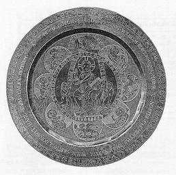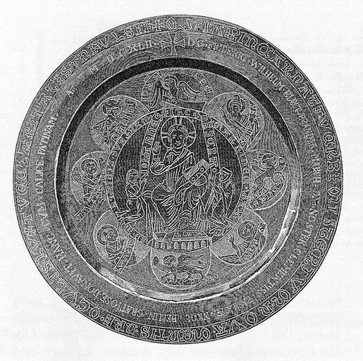 | Keywords: Patene Chorin.JPG Patene Abendmahlsteller von 1280/1290 aus dem Kloster Chorin heute in der Berliner Nikolaikirche Sie zeigt neben dem zentralen thronenden Gott laut Inschrift den Brandenburger Markgrafen Mitregent Johann II und seine Gemahlin Hedwig von Werle Der innere später hinzugefügte Ring hält fest dass der Große Kurfürst die Patene 1642 der Berliner Nikolaikirche schenkte Paten created 1280/1290 in the abbey Kloster Chorin showing Co-ruler Margrave John II ca 1237 “1281 Margraviate of Brandenburg and his wife Hedwig von Werle Wolfgang Erdmann Zisterzienser-Abtei Chorin Geschichte Architektur Kult und Frömmigkeit Fürsten-Anspruch und -Selbstdarstellung klösterliches Wirtschaften sowie Wechselwirkungen zur mittelalterlichen Umwelt Unter Mitarbeit von Gisela Gooß Manfred Krause u Gunther Nisch Mit ausführlichem Literaturverzeichnis Königstein i Ts 1994 Die Blauen Bücher ISBN 3-7845-0352-7 page 12 Der Teller befindet sich in der Berliner Nikolaikirche 1280/1290 author PD-old Liturgy Patens Kloster Chorin historische Abbildungen Johann II Brandenburg Hedwig of Werle |