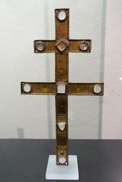 | Keywords: Patriarchal Cross from a Reliquary, Rhine Meuse region, c. 1220-1230, gilt brass, rock crystal - Museum Schnütgen - Cologne, Germany - DSC00165.jpg en Exhibit in the Museum Schnütgen - Cologne Germany 2015-11-29 08 52 32 own Daderot other versions PD-old-100 cc-zero Metalwork in Museum Schnütgen | ||||