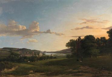 Keywords: patrick nasmyth painting oil on canvas artistic nature outside sky clouds landscape country countryside sunset forest trees lake water village