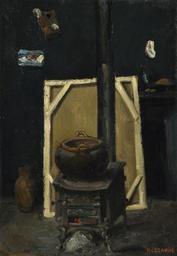 | Keywords: Paul Cézanne, The Stove in the Studio, ca. 1865.jpg Artwork en This view of the artist's studio was probably painted in Paris During this period Cézanne divided his time between his native Aix-en-Provence and Paris and the picture evokes the privation of his Bohemian existence in the capital On the right a single flower stands in a vase on a table A canvas stretcher is visible behind the stove and a palette and what may be a small picture hang on the wall at the left The first owner of this work was Cézanne's boyhood friend the writer Emile Zola ~ 1865 Oil on canvas 41 x 30 cm Institution National Gallery London object history exhibition history credit line Acquired from the estate of Mrs Helen Chester Beatty under the acceptance-in-lieu procedure 1992 http //www nationalgallery org uk/paintings/paul-cezanne-the-stove-in-the-studio National Gallery London Signed accession number NG6509 PD-100 Paintings of Paris artist's studio interiors Still life paintings by Paul Cézanne Paintings by Paul Cézanne in the National Gallery London 1865 paintings in France Stoves in art Stretcher bars Pottery in painting |