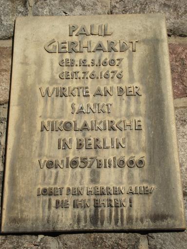 | Keywords: Paul Gerhardts Gedenktafel an der Berliner Nikolaikirche.jpg Gedenktafel zu Ehren Paul Gerhardts an der Nikolaikirche in Berlin Memorial tablet for Paul Gerhardt at the wall of the Nikolaikirche in Berlin Памятная доска в честь Пауля Ге ха дта на стене це кви Св иколая в Бе лине Eigene Aufnahme Own photograph Собственная фотог афия 2007-09-20 Anton Huttenlocher Huttenlocher Paul Gerhardt Plaques at Nikolaikirche Berlin Lobet den Herren | ||||