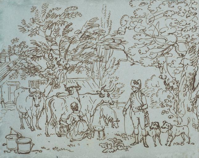 Keywords: Paul Sandby - Landscape with a Milk Maid and a Beau - Google Art Project.jpg No inscription Inscription _Signed_and_Dated Not signed not dated Not on View Pen and brown ink on medium blue slightly textured wove paper mounted on medium cream slightly textured wove paper cows dogs man woman milk trees landscape special url_id dwG-o-74Qq5ezQ PD-old-100-1923 1809 Drawings by Paul Sandby Google Art Project works by Paul Sandby Milkmaids in art |