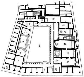 | Keywords: Pauly-Wissowa II2 2751-Stabianer-Thermen-Pompeii.png de Grundriss der sog Stabianer Thermen in Pompeii<br>Durch den Haupteingang 1 und den Nebeneingang 8 betritt man die Palaestra 2; rechts an dieser ist 3 eine mit Fliesen belegte Bahn auf der von 9 aus Steinkugeln gerollt wurden deren zwei hier gefunden sind 10 Platz eines Aufsehers der Palaestra Weiter links das Schwimmbassin 6 und neben demselben zwei ursprünglich je ein flaches Bassin enthaltende bedeckte Räume 5 und 7 etwa 0 65 m tief in welche aus der Westwand ein Wasserstrahl fiel Sie dienten wohl zu Abwaschungen und Douchebädern; doch ist in 7 das Bassin später ausgefüllt und der Raum anderweitig verwandt worden 4 Auskleideraum mit Spuren von Schränken an den Wänden Rechts an der Palaestra die eigentlichen Baderäume 21 “25 Männer- 16 “19 Frauenbad in der Mitte zwischen beiden die Heizvorrichtung 20 Und zwar sind 24 + 25 und 16 Apodyterien dieses mit zwei besonderen Strasseneingängen 15 17 jenes mit zwei Vorräumen 26 27 welche Bänke für die wartenden Diener enthalten 22 Frigidarium während 16 in einer Ecke das Bassin für das kalte Bad enthält 18 23 Tepidarien 19 21 Caldarien beide mit alveus am einen und labrum am anderen Ende Endlich liegen an dem Gange 13 mit Eingang von der Strasse und von der Palaestra vier in der letzten Zeit nicht gebrauchte Einzelzellen mit je einer gemauerten Wanne und der Abtritt 14 Beschreibung vom Urheber Paulys Realencyclopädie der classischen Altertumswissenschaft Band II 2 Sp 2751-2752 August Mau 1896 PD-old Paulys Realencyclopädie der classischen Altertumswissenschaft Band II 2 Maps from Pauly-Wissowa Stabian Thermae Pompeii August Mau Plans of ancient Roman thermae in Pompeii |