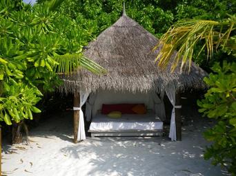 Keywords: pavilion thatched roof bed sand hidden maldives