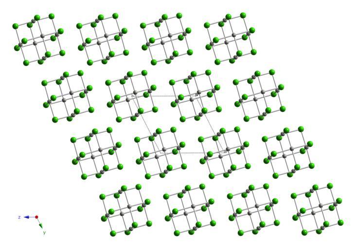 | Keywords: Pd6Cl12-xtal-1996-CM-3D-balls.png Ball-and-stick model of part of the crystal structure of the beta polymorph of palladium II chloride PdCl<sub>2</sub> Colour code Palladium Pd grey Chlorine Cl green Crystal structure from http //dx doi org/10 1002/anie 199613311 Angew Chem Int Ed 1996 35 1331 1333 Model constructed and image generated in http //www crystalmaker com/ CrystalMaker 8 2 Own 2010-06-17 Ben Mills Benjah-bmm27 Images by Ben Mills Crystal structure of the beta polymorph of palladium II chloride |