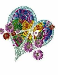Keywords: Peace love hope and flowers + other elements inside heart shaped peace sign composition peace hippie