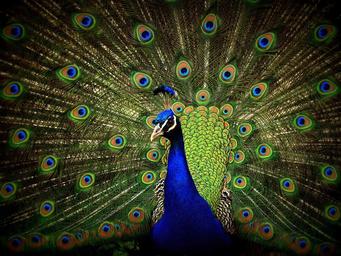 Keywords: peacock close-up display green blue colorful bird plumage turquoise exotic