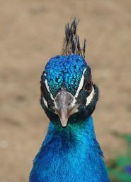Keywords: peacock head plume blue beak bird male peafowl wildlife vibrant exotic neck fowl black white eye nature animal frontal portrait