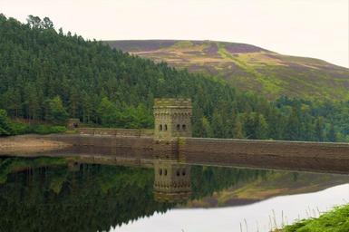 Keywords: peak district reservoir howden reservoir dam howden dam 617 squadron dam busters trees calm water reflections