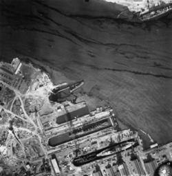 | Keywords: Pearl Harbor drydocks after attack Dec 1941.jpg Vertical aerial view of the Pearl Harbor Navy Yard on 10 December 1941 showing damage from the Japanese raid three days earlier In upper center is the floating drydock YFD-2 with the destroyer USS Shaw DD-373 whose bow was blown off floating at an angle at one end The torpedoed light cruiser USS Helena CL-50 is in Drydock Number Two in center for repairs She was the first ship to use that newly constructed dock <br> Drydock Number One is just below Drydock Number Two It holds the relatively undamaged battleship USS Pennsylvania BB-38 and the wrecked destroyers USS Cassin DD-372 capsized and USS Downes DD-375 Note dark oil streaks on the harbor surface U S Navy National Museum of Naval Aviation photo No http //collections naval aviation museum/emuwebdoncoms/pages/doncoms/Display php irn 28414 QueryPage 2Femuwebdoncoms 2Fpages 2Fdoncoms 2FAdvQuery php 1996 488 029 074; also official U S Navy photograph http //www history navy mil/our-collections/photography/wars-and-events/world-war-ii/pearl-harbor-raid/post-attack-ship-salvage/general-views/80-G-387598 html 80-G-387598 National Archives Collection 1941-12-10 U S Navy PD-USGov-Military-Navy Pearl Harbor attack - aftermath and salvage Pearl Harbor Naval Shipyard |