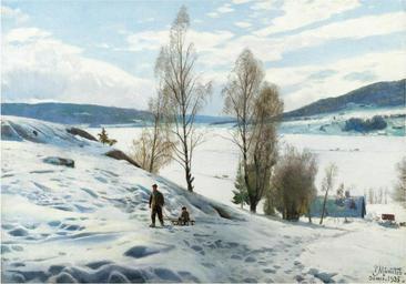| Keywords: Peder Mønsted - Vinterdag ved Odnes, Norge.jpg Artwork Creator Peder Mønsted 1935 Oil on canvas cm 35 5 50 5 object history Provenienz Kleis Georg Westerbro credit line signed and dated P Mônsted / Odnes 1935 lower right; titled and inscribed Randsfjorden on the reverse accession number http //www sothebys com/de/auctions/ecatalogue/2008/the-scandinavian-sale-l08104/lot 273 html Sotheby's PD-old-70 Peder Mønsted Winter in art Landscape paintings of Norway 20th-century landscape paintings Images from Sotheby's Sledding in Norway |