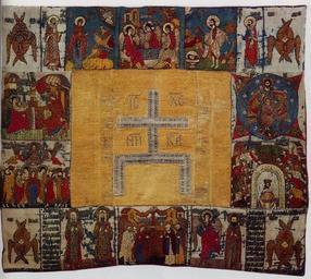 | Keywords: Pelena by Sophia Palaiologina.jpg П аздники и святые Пелена 1499 г Вклад великой княгини Софьи Палеолог ате иал Тафта шелковые се еб яные и золотные нити есто х анения Се гиево-Посадский госуда ственный исто ико-художественный музей-заповедник П оисхождение П оисходит из Т оице-Се гиевой лав ы Разме 103 х 122 Сох анность и естав ация Д евний фон каймы - зеленовато-голубоватая тафта - почти полностью ут ачен видны лишь его следы на подложенном снизу белом холсте; во многих местах ут ачен ко ичневый шелк в складках одежд; ткань с едника ветхая В конце XVIII в д евний атласный фон с едника заменен полупа човой желтой тканью а к ест из се еб яных д обниц и жемчуга - золотным галуном Рестав и ована в 1971 -1974 гг в ВХ РЦ им И Э Г аба я П Рябовой ук еплен с едник большим стежком с п ик епой; т и клейма на ве хнем поле ук еплены естав ационным фоном в цвет ут аченного авто ского; иглой и нитью ук еплены все подлинные детали Опись 1641 г л 127 об - 128 дает возможность п едставить пе воначальный вид пелены Пелена ветха се едина отлас че вчат к ест низан жемчюгом а меж жемчюгу д обницы мелки басменные опушка тафта зелена а на ней шиты п аздники шелки и золотом и се еб ом подложена к ашениною Описание а с еднике - Голгофский к ест из галуна на кайме - изоб ажения святых и п аздников аве ху в цент е - Т оица слева от нее - Богомате ь Боголюбская и Иоанн Златоуст сп ава - Иоанн П едтеча и апостол Тимофей а левой кайме - Благовещение и Вознесение на п авой - Отечество и Сошествие Святого Духа на апостолов Внизу - Явление Богомате и Се гию по сто онам его - мит ополиты Пет и Алексей а хангел Гав иил и Василий Па ийский По углам хе увимы и се афимы Изоб ажения шиты в аскол шелками азных цветов и оттенков В шитье нимбов деталей одежд к ыльев ангелов символов евангелистов использованы нити п яденого золота и се еб а; шитье в п ик еп клопец го одок ягодка а нижней кайме вышита се еб ом в два столбца исто ическая летопись о вкладе http //lib pstgu ru/icons/index2 php option com_content view article id 559135383 3C 1499 Вклад великой княгини Софьи Палеолог PD-old-100 Embroidery in Museum of Sergiev Posad 15th-century Russian orthodox embroidery Icons of the True Cross Sophia Palaiologina Embroidery of Russian tsarinas and Grand Duchess Files uploaded by Shakko from various sources Pelena |
