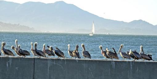 Keywords: pelican bird brown pelican pelecanus pelecanus occidentalis bay water wildlife san francisco america usa