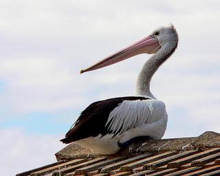 Keywords: pelican roof resting bird wildlife nature perched building icon beak wild feather looking rooftop