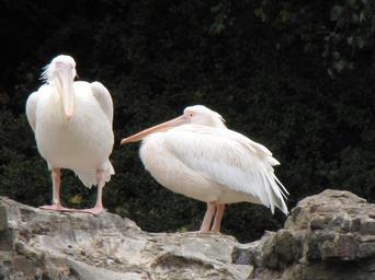 Keywords: pelicans birds white plumage feathers bright light two couple pair water birds wildlife rocks rocky stones fauna