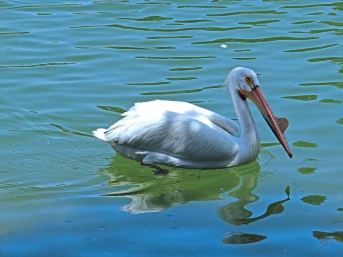 Keywords: pelicans swimming water birds white feathers long beak large throat pouch bright day blue green lake pond waves swims wildlife single alone isolated nature fauna reflections