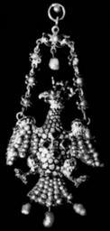 | Keywords: Pendant Polish Eagle Royal Casket.JPG Pendant - the Polish Eagle on a chain Royal Casket Wisiorek - Orzeł Polski na łańcuszku Szkatuła Królewska attributed to s 1600 Gold pearls rubies emeralds cm 3 2 8 Catalogue of stolen and missing cultural achievements / comp Jan Świeczyński; Ośrodek Informacyjno-Koordynacyjny Ochrony Obiektów Muzealnych Warsaw 1988 Editor Wojciech Jaskulski Piotr Ogrodzki See also http //kolekcje mkidn gov pl/ Department of National Heritage Wartime losses an official webpage of Polish Ministry of Culture Art and National Heritage PD-Art Photo Photo http //kolekcje mkidn gov pl/katalog/podglad ID 10943 Department of National Heritage Wartime losses an official webpage of Polish Ministry of Culture Art and National Heritage author < 1939 PD-Polish Anonymous-EU Mikołaj Siemiradzki Royal Casket Pendants from the Polish Vasa Collection Historical coats of arms of Poland in art Jewellery of Poland 17th-century jewellery Pendants |