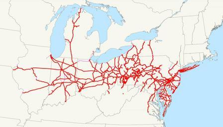 | Keywords: Pennsylvania Railroad system map (1918).svg This is a map of the Pennsylvania Railroad system as of 1918 with trackage rights in purple and future lines dotted The two disconnected pieces in West Virginia are not an error; they are remaining portions of the Little Kanawha Syndicate properties that were partially controlled by the PRR-owned Pennsylvania Company Email me if you would like a copy of the GIS data I created modified from Bureau of Transportation Statistics North American Transportation Atlas Data or if you see any errors 2009-03-18 own assumed NE2 Maps of the Pennsylvania Railroad |