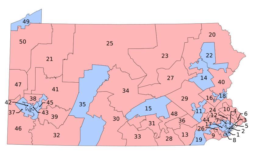 | Keywords: Pennsylvania Senate party composition (2015).svg A map of the Pennsylvania State Senate districts colored by party as of March 1 2015 for the 2015-2016 session ffb6b6 Republican senator b0ceff Democratic senator white Vacancy Based on File PA State Senate districts blank 2015 svg 2015-03-01 User Mr Matté/Author template Political maps of Pennsylvania Maps created by User Mr Matté | ||||