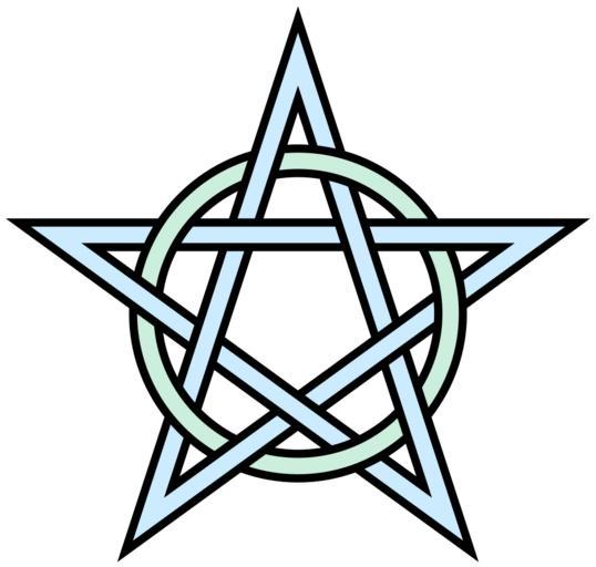 Keywords: Pentagram-circle-interlaced.svg Ornamental interlaced pentagram and circle topologically equivalent to File Pentagonal-knot svg Self-made graphic based on abstract geometry a circle with radius 150 and a pentagram with its outer vertices 250 units from the center both stroked with an outer width of about 32 and an inner width half that So converted from a version of the following vector PostScript source code <pre> 306 396 translate/plr 250 dup 3 2 roll 72 mul 90 add dup 3 1 roll cos mul 3 1 roll sin mul def/A 0 0 150 0 360 arc closepath stroke 3 plr 1 plr 4 plr 2 plr 0 plr moveto 4 lineto repeat closepath stroke def 32 setlinewidth A 1 setgray 16 setlinewidth A showpage EOF</pre> 2009 AnonMoos 2 component links Decorative knots Pentagrams 5-fold rotational symmetry 15 crossing number knots and links Outline knots and links Images with PostScript source code |