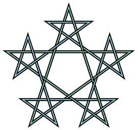 | Keywords: Pentagrams-interlaced-pattern.svg Decorative pattern of a pentagram interlaced with another self-intersecting closed polygonal line to give five smaller pentagrams For another pattern of interlaced pentagrams see File Pentagrams-pentagon-interlaced svg Self-made graphic converted from a version of the following vector PostScript source code <pre> 306 396 translate 87 dup scale 1 setgray 4 227272 setlinewidth/plr 25 sub 2 47213472 12 5 mul mul dup 3 2 roll 72 mul 90 add dup 3 1 roll cos mul 3 1 roll sin mul def/P 3 4 plr 1 4 plr 4 4 plr 2 4 plr 0 4 plr moveto 4 lineto repeat closepath gsave 0 setgray 15 5 setlinewidth stroke grestore stroke def/x 7 630809 def gsave 2 x plr translate P grestore gsave 3 x plr translate P grestore gsave 4 x plr translate P grestore gsave 0 x plr translate P grestore gsave 1 x plr translate P grestore showpage EOF</pre> 2009 AnonMoos Pentagrams Decorative knots Images with PostScript source code 5-fold rotational symmetry 2 component links |