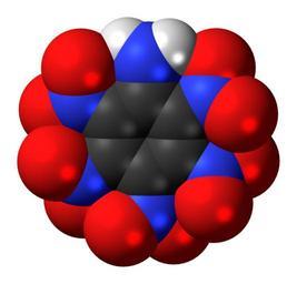 | Keywords: Pentanitroaniline-3D-spacefill.png Space-filling model of the pentanitroaniline molecule an explosive nitro compound Colour code 505050 Carbon C black<br> F0F0F0 Hydrogen H white<br> F51E1E Oxygen O red<br> 3C50FA Nitrogen N blue<br> 2011-01-27 own DS Visualizer Jynto talk Ball-and-stick version cc-zero Pentanitroaniline Images by Jynto |