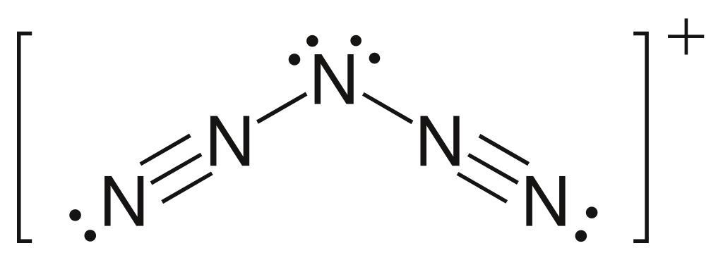 Keywords: Pentanitrogen cation.svg en N<sub>5</sub><sup>+</sup> cation Own Choij 2009-09-12 Nitrogen Cations