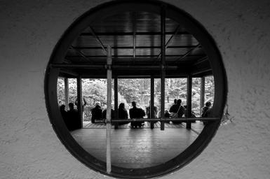 Keywords: people black and white circle peeking sitting waiting park garden black white person looking japan japanese garden the hague netherlands