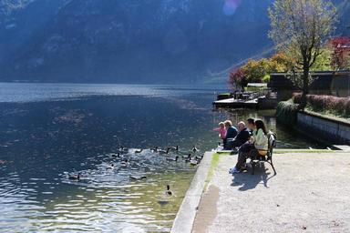 Keywords: people children autumn peaceful calm family time nature ducks blue water lake hallstatt austria slow life relaxing morning breezes scenic foggy