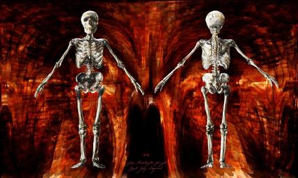 Keywords: people cruelty solitude dark tragedy fire flames hell delirium hallucination vision victim executioner bones skeleton man woman holy die funeral