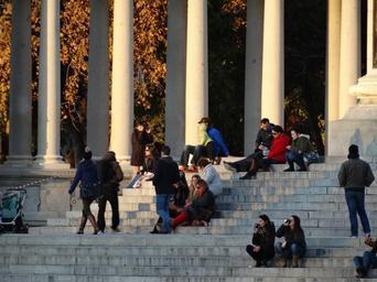 Keywords: people hold on couples monument group waiting for you women men stairs columns crowd