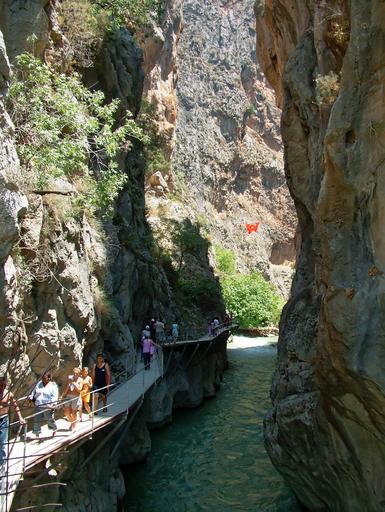 Keywords: people holidaymakers tourism river cliffs pathway walking flag trees stone rockface travel vacation tourist summer person holiday trip family leisure cheerful fun attraction outdoors shadow running water ripples waves