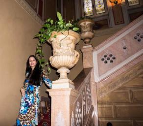 Keywords: people person woman female antiques fashion stairs plant dress hair happy white self portrait selfie villa cortine palace stained glass caucasian cheerful lake garda sirmione italy enjoyment leisure relaxation elegant