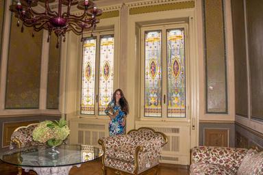 Keywords: people person woman female antiques fashion dress hair happy white self portrait selfie villa cortine palace stained glass chandelier caucasian cheerful lake garda sirmione italy enjoyment leisure relaxation elegant victorian